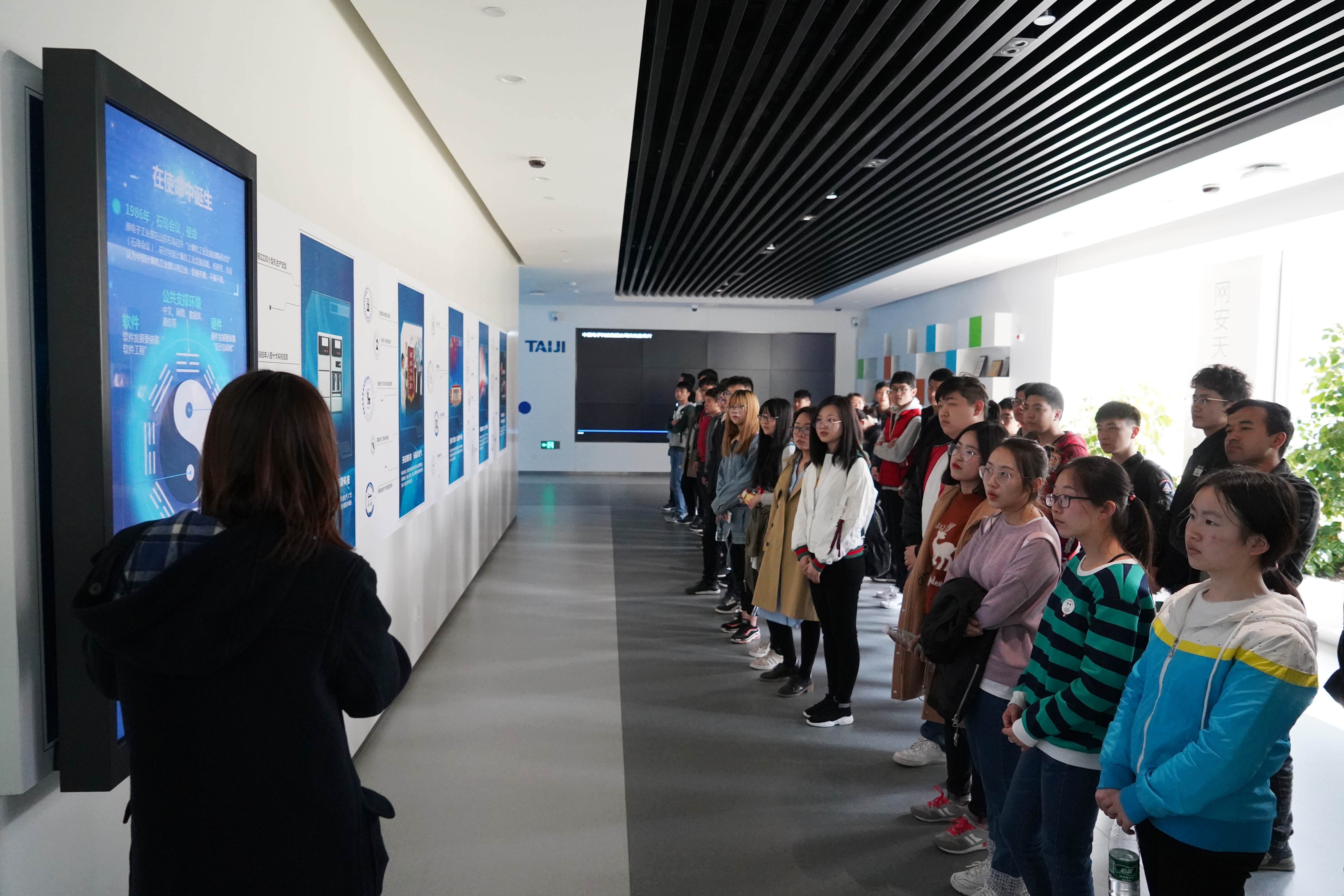 在太极计算机股份有限公司工作人员的引导讲解下,师生们了解了太极的发展历程,并先后参观了太极解决方案中心和安全可靠系统工程研究中心。在太极解决方案中心,工作人员给同学们仔细讲解了智慧国家政务、智慧城市、智慧园区、互联网+行业和智慧企业管理的概念和典型解决方案。在安全可靠系统工程研究中心,工作人员对公司自主研发的安全可靠硬件、软件、云平台和解决方案进行了介绍。